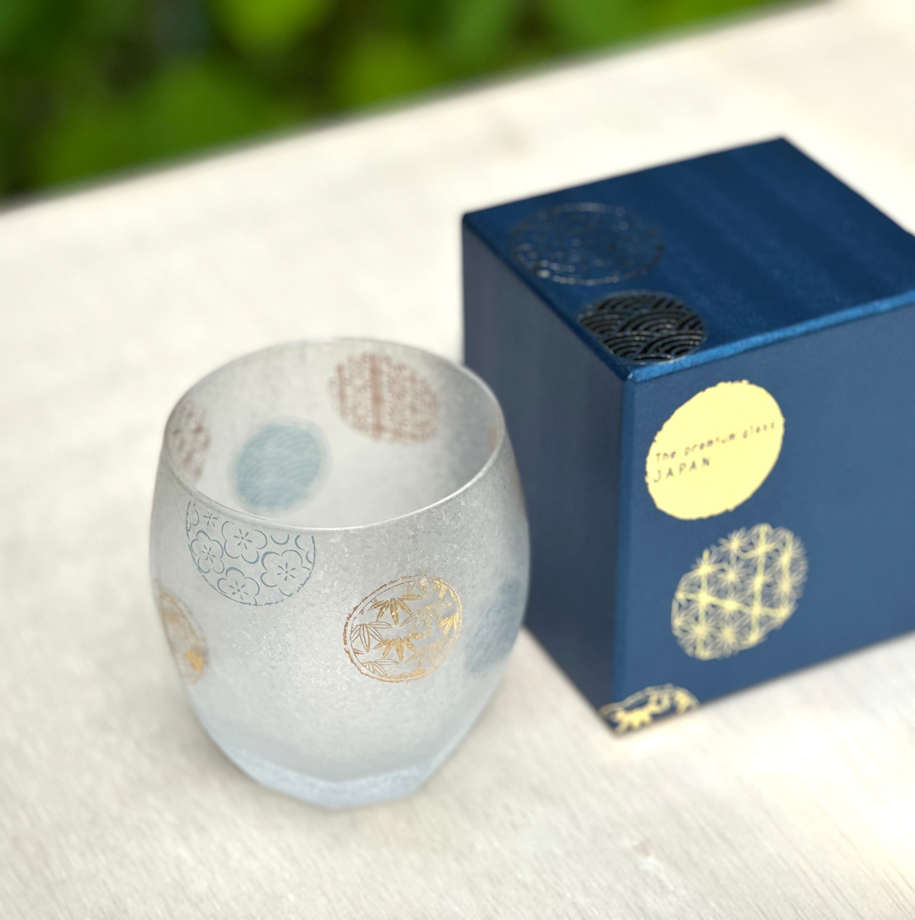 まるで水晶のようにキラキラと煌くグラス表面に、 丸紋紋様が踊るモダンで涼しげな風合いの オールドグラスグラスです。