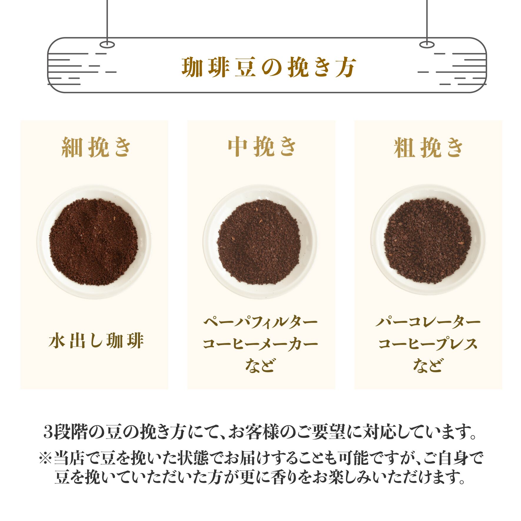 ※当店で豆を挽いた状態でお届けすることも可能ですが、ご自身で豆を挽いていただいた方が更に香りをお楽しみいただけますので、豆の状態でのご配送をお勧めしています。