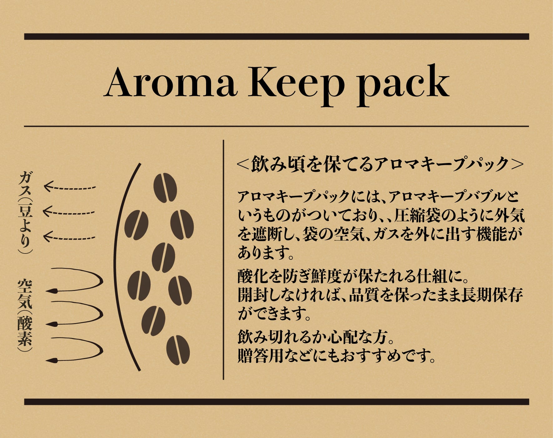 アロマキープパックには、アロマキープバブルがついており、圧縮袋のように外気を遮断し、袋の中の空気、ガスを外に出す機能があります。そのため酸化を防ぎ鮮度が保たれる仕組みに。