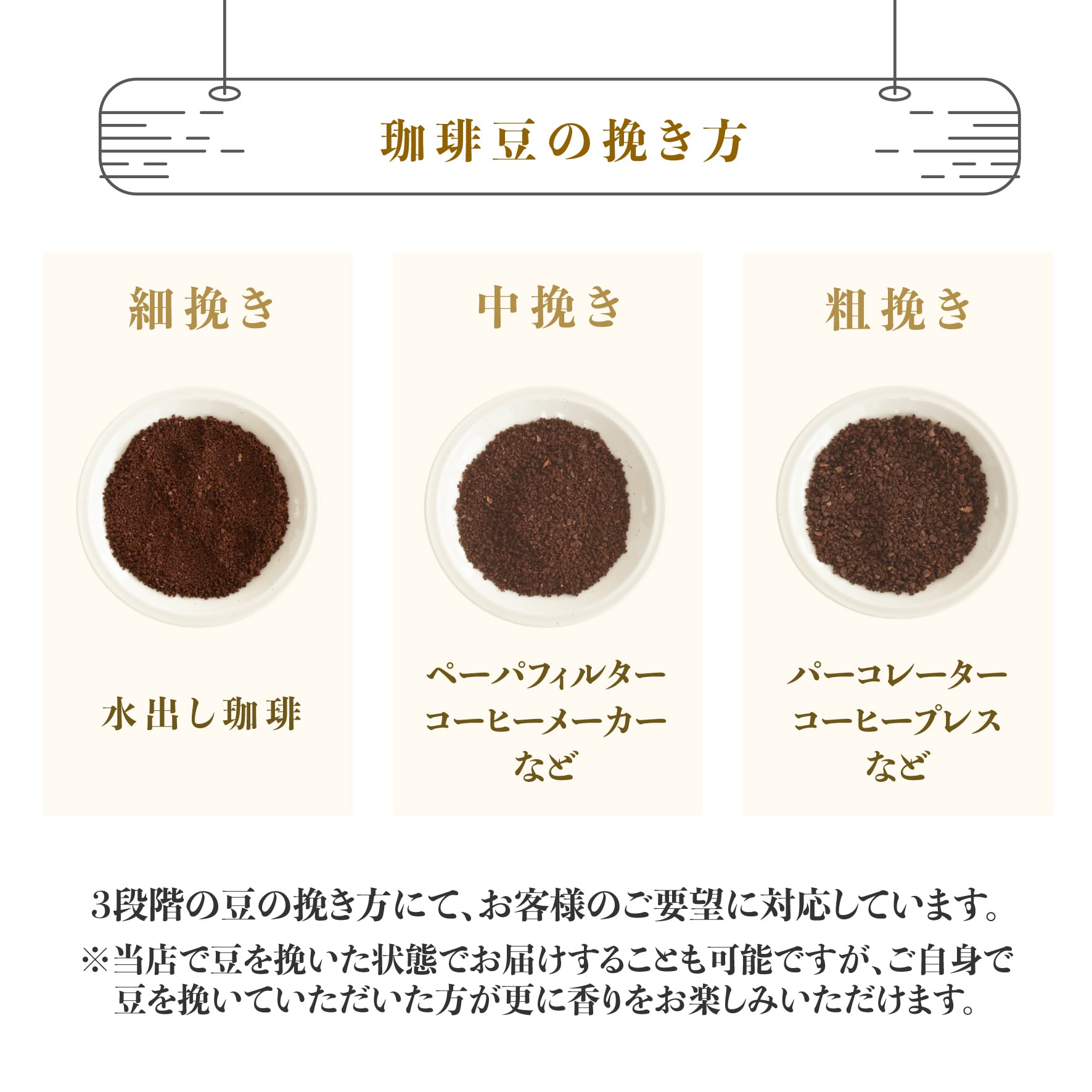 当店では3段階の豆の挽き方に分けて、お客様のご要望に対応しています。